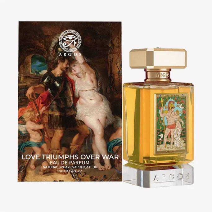 Argos Love Triumphs Over War is a luxury fragrance released in 2023, inspired by the eternal balance between passion and conflict. Designed as an artistic unisex scent, it embodies strength, romance, and the triumph of love through a complex symphony of vibrant notes. The fragrance begins with an exhilarating burst of rose petals, raspberry, black currant, citrus, and tuberose that immediately captivate the senses with both sweetness and brightness. As it unfolds, the heart reveals clove, geranium, violet, iris, gardenia, cinnamon, and ylang-ylang, blending floral elegance with a touch of warm spice. Finally, the scent settles into a deep and long-lasting base of Mysore sandalwood, cashmere wood, white musk, vanilla, amber, and patchouli, creating an unforgettable aura of richness and refinement. With its dramatic contrasts of fruity brightness, floral romance, and woody warmth, Love Triumphs Over War is a fragrance for those who value bold storytelling, timeless artistry, and sensual sophistication.